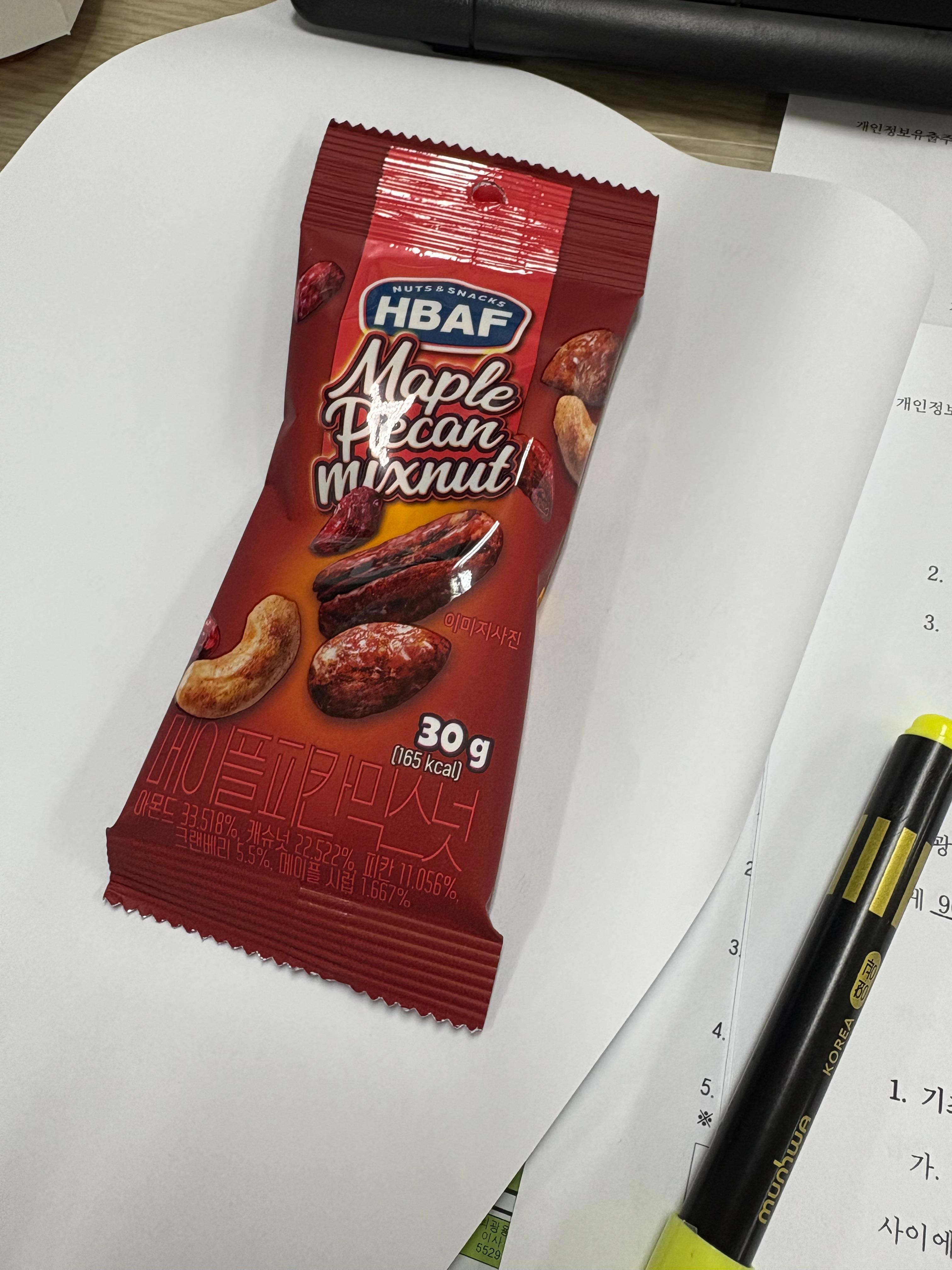당 떨어질 때마다 저의 구세주가 되어주는 HBAF 메이플 아몬드예요. 아몬드, 캐슈넛 등 다양한 견과류에 달콤한 메이플 시럽이 코팅되어 있어, '고소 달달'의 정석을 맛볼 수 있죠.