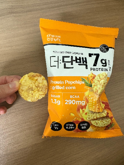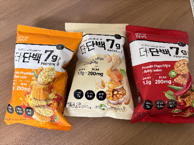 더단백 팝칩 3종(군옥수수맛, 매콤살사맛, 허니갈릭맛)을 맛본 솔직 후기를 가져왔어요! 1봉에 단백질이 7g이나 들어있다고 해서 운동하는 분들께 딱 좋을 것 같아요. 계란 한 개 분량이라니, 계란 지겨울 때 간식으로 최고겠죠?